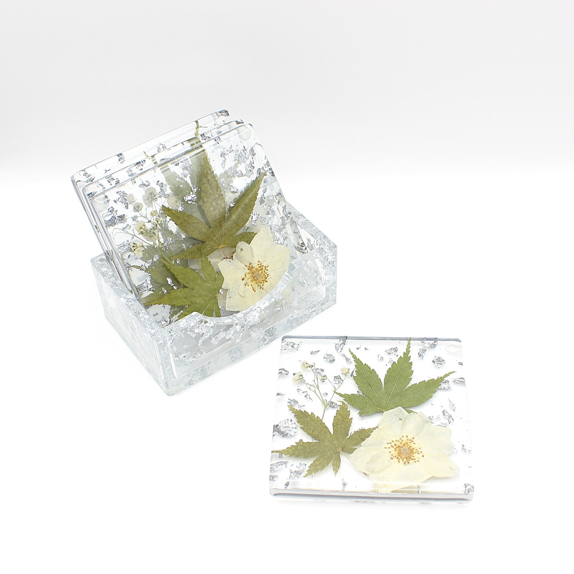 These handmade pressed flower coasters are truly one of a kind. The set of 4 features real pressed flowers and metallic silver flakes embedded in durable resin. With rubber feet on the bottom to protect your furniture and a top coat of tabletop grade resin they can withstand daily use while maintaining their beauty. These make a unique and stylish gift or as an addition to your own home decor.